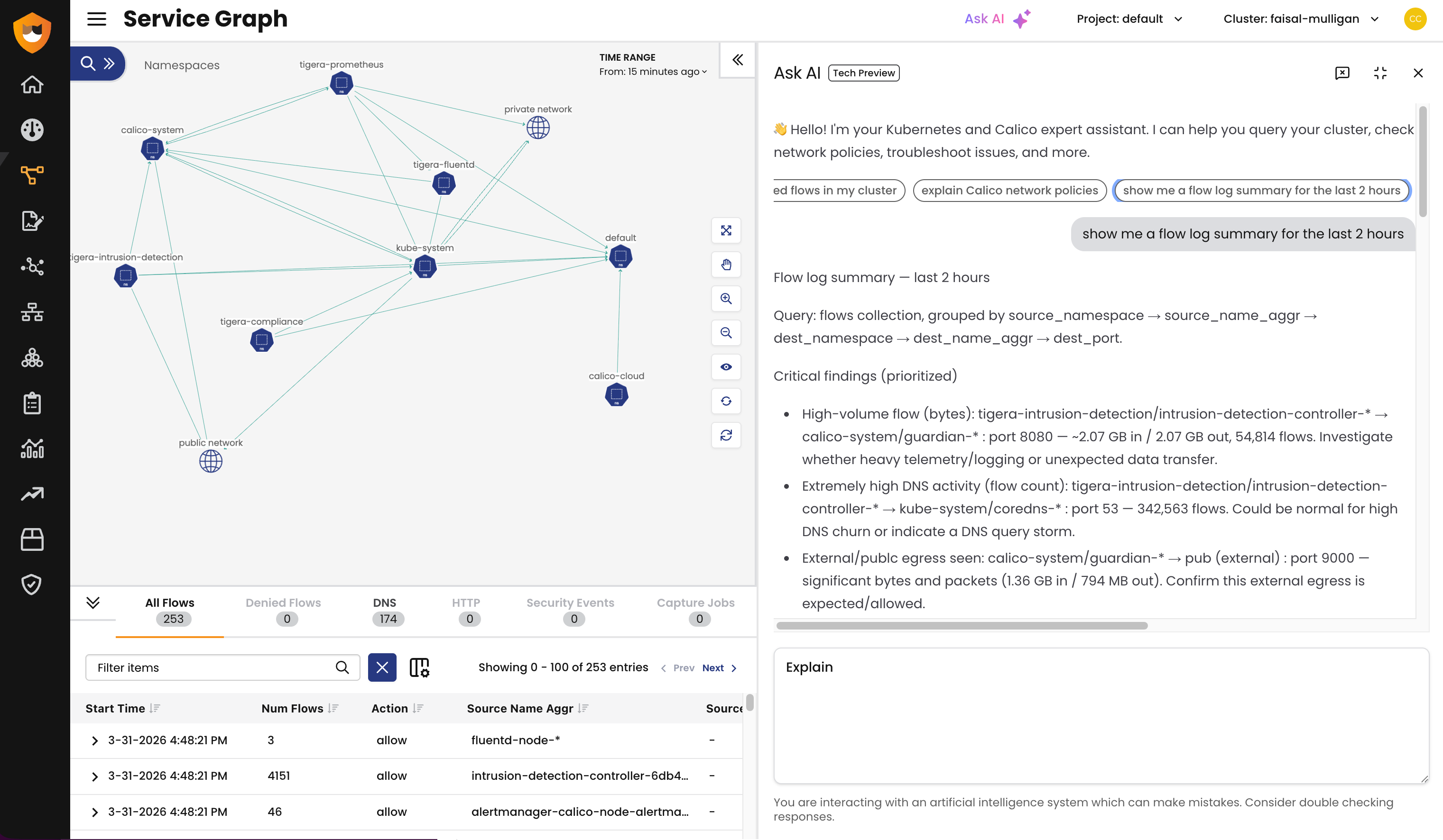 What sets Mylo apart from a general-purpose AI is that it has real-time, read-only access to your actual cluster environment. Mylo can query your flow logs (including flow, DNS, and L7 logs), inspect Kubernetes resources (anything accessible via kubectl), and draw on a knowledge base built from Calico and Kubernetes documentation.